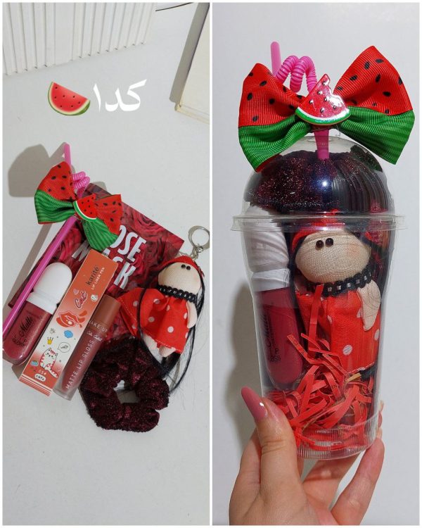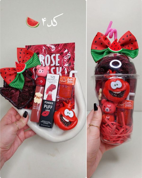 کد۴: ماسک ورقه ای، لیپ گلاس میوه ای، رژلب کره ای کوشنی، رژلب جامد، کش، گلسر انبری، لاک مینی، شمع انار، پوشال، ظرف آیس پک