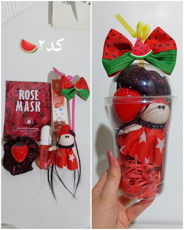 کد۱: ماسک ورقه‌ای، لیپگلاس، ماژیک شیدینگ گلبهی، رژلب مایع، جاسویچی عروسک روسی، کش سر، گلسر، آیس پک، پوشال
